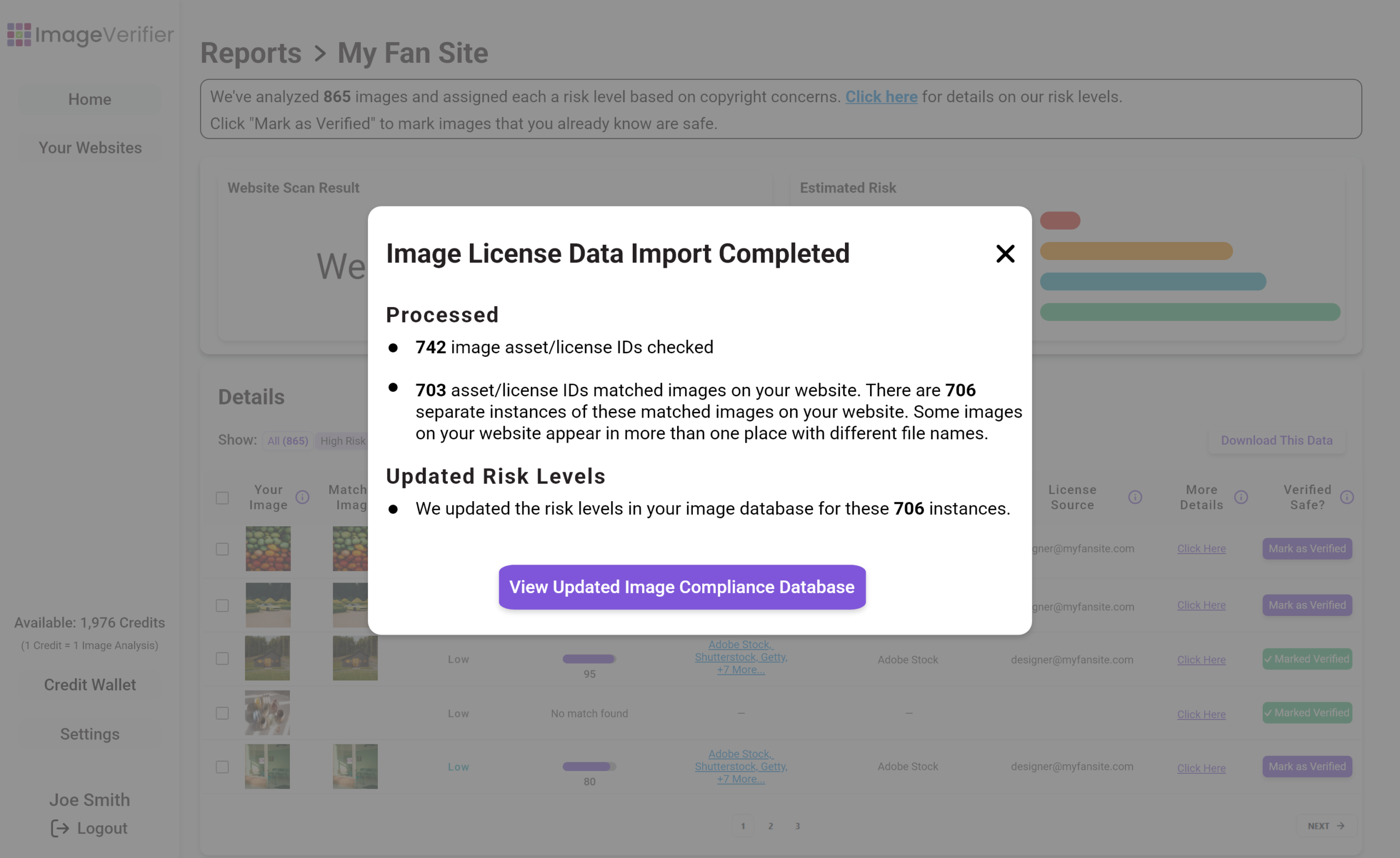 Using the spreadsheet import feature, you can bring in your existing license data from any stock image provider and import it into ImageVerifier. This helps identify potential matches for images found on your site, automatically updating their risk level when license data is imported.